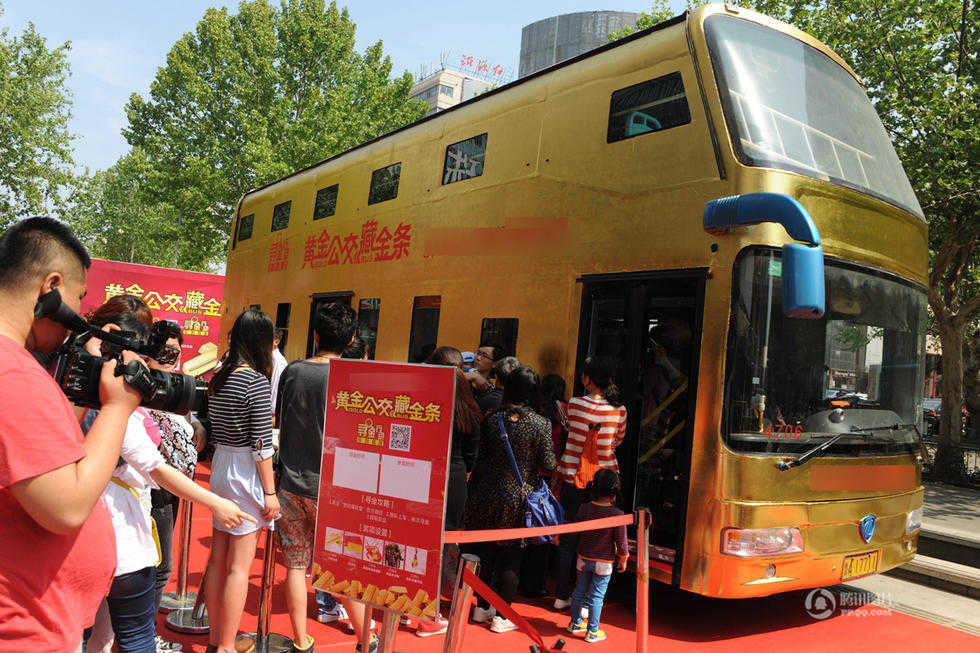 4月25日,一輛“黃金公交車(chē)”亮相山東濟(jì)南。據(jù)介紹,該公交車(chē)80%的部分都貼了金箔,“黃金美女”模特身上佩戴的黃金飾品價(jià)值兩百萬(wàn),公交車(chē)車(chē)內(nèi)掛滿(mǎn)了數(shù)千件黃金飾品,重達(dá)幾十公斤,總共價(jià)值500余萬(wàn)。(來(lái)源:騰訊新聞 陳寧/CFP)