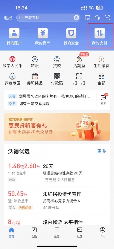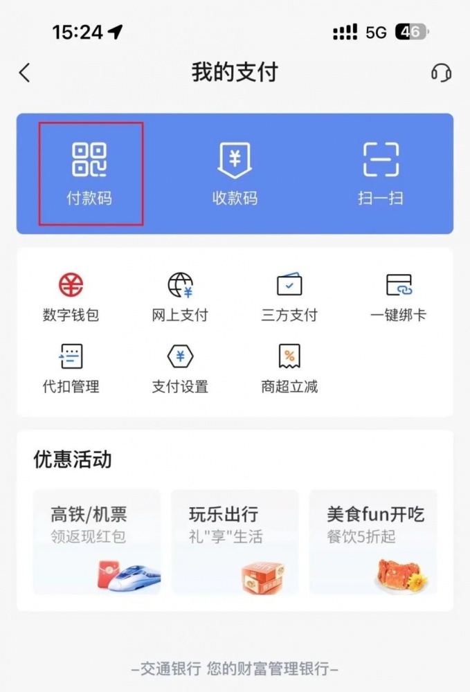第一步:登錄交通銀行手機銀行APP-首頁-我的支付-付款碼