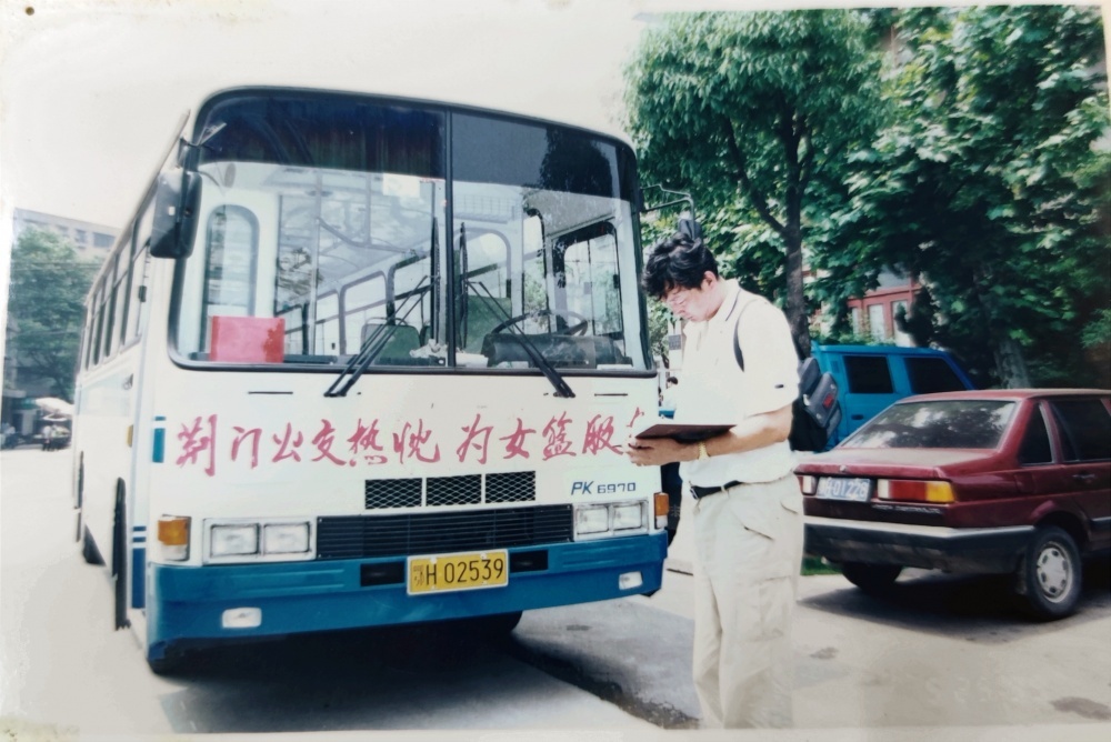 ▲1999年5月25日,沈陽(yáng)電梯隊(duì)隊(duì)員、教練乘坐公交出行。公交車(chē)頭還掛有“荊門(mén)公交熱忱為女籃服務(wù)”橫幅。