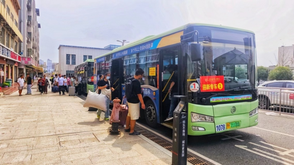 9月6日早上6點(diǎn)00分,市公交集團(tuán)將掛有“迎新專車”牌子的定制專車車隊(duì),整齊地??吭诨疖囌颈睆V場進(jìn)行等待。