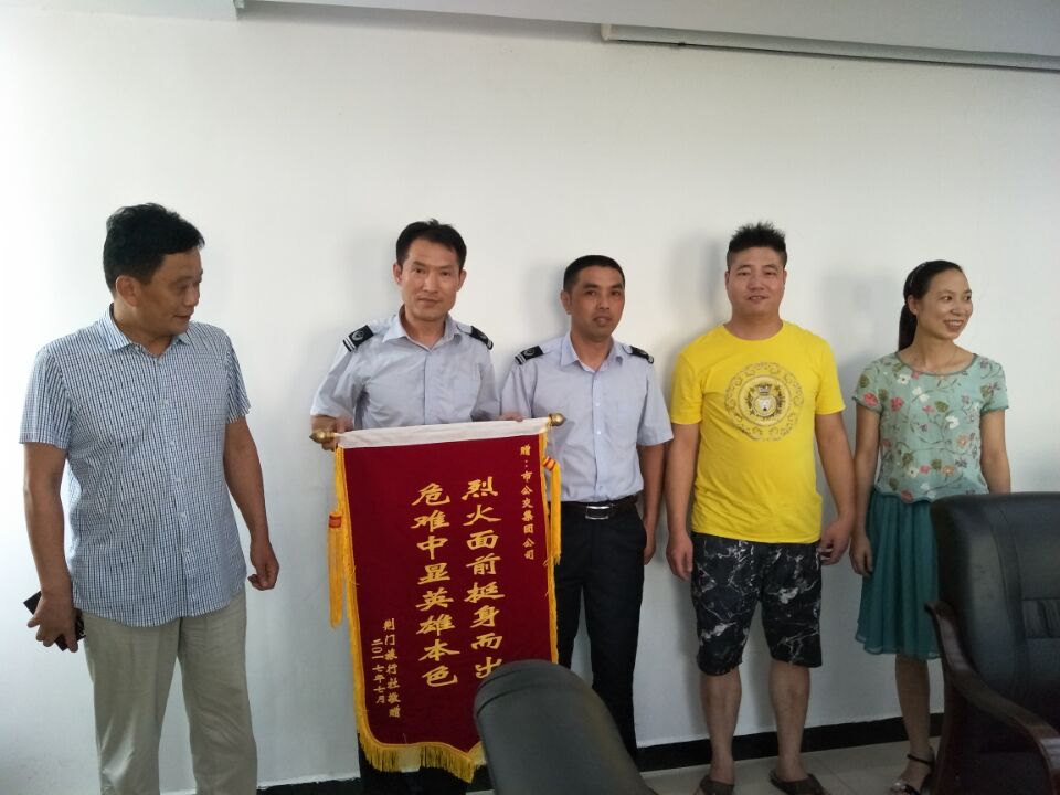 7月27日,荊門市旅行社出租汽車公司負(fù)責(zé)人及鄂H0A073的駕駛員專程來到荊門公交集團(tuán)公司,為果斷義舉滅火的公交陳旭師傅送上了一面“烈火面前挺身而出,危難中顯英雄本色”錦旗。