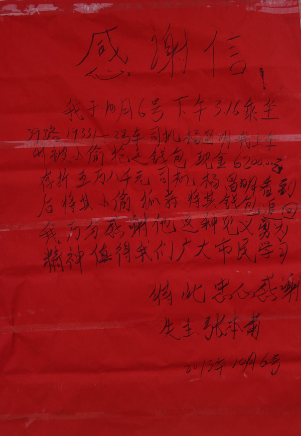就在大家為這名錢包被偷的女子惋惜時,一名穿紅色T恤、黑色褲子的男子趁亂穿過馬路匆匆離開,坐在后排的一位乘客再也忍不住,大喊起來:"我看到就是他偷的!"此時,紅T恤男子已經(jīng)朝金龍泉大道啤酒廠方向走去。司機楊昌明見狀,立即開門,跳下駕駛室邊追邊大喊"站住"。聽到喊聲,紅T恤男子撒腿就跑,楊昌明和兩名熱心乘客緊跟著追去。眼見楊昌明和兩名熱心乘客越追越近,紅T恤男子將一個紅色錢包丟在了地上,楊昌明將錢包撿起后沒再追趕。當楊昌明返回車上,女失主卻已經(jīng)不見了,在一車乘客的見證下,楊昌明打開錢包,發(fā)現(xiàn)錢包內(nèi)有6200元現(xiàn)金和一些存款單。為了不耽誤車上的乘客出行,楊昌明暫時將錢包保管,驅(qū)車離開。